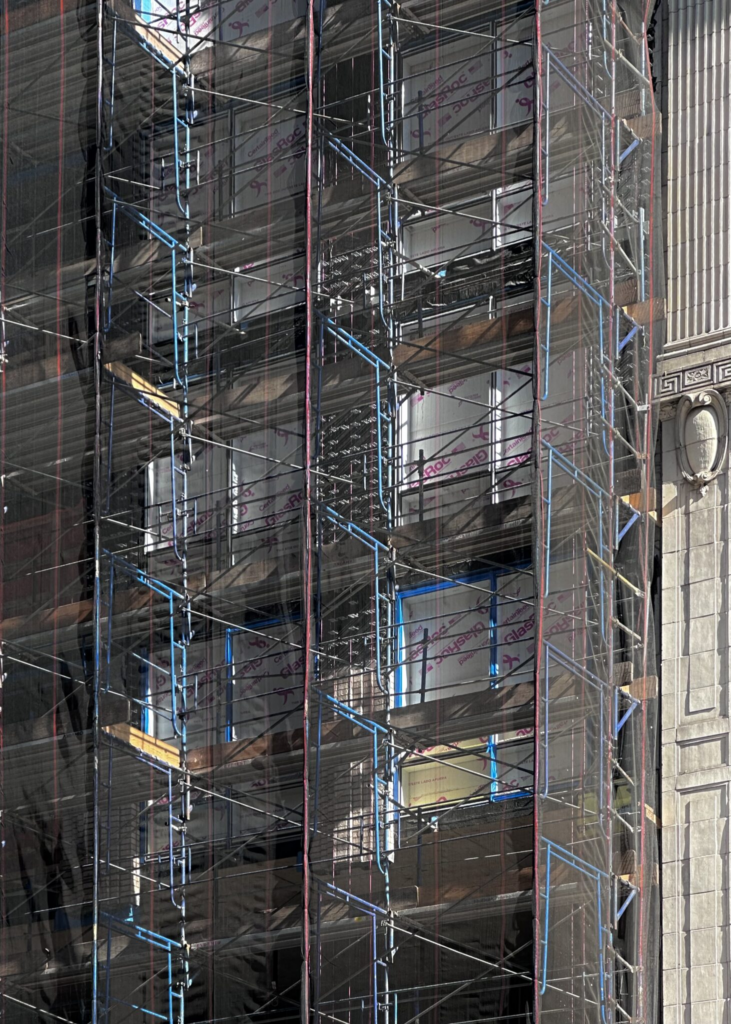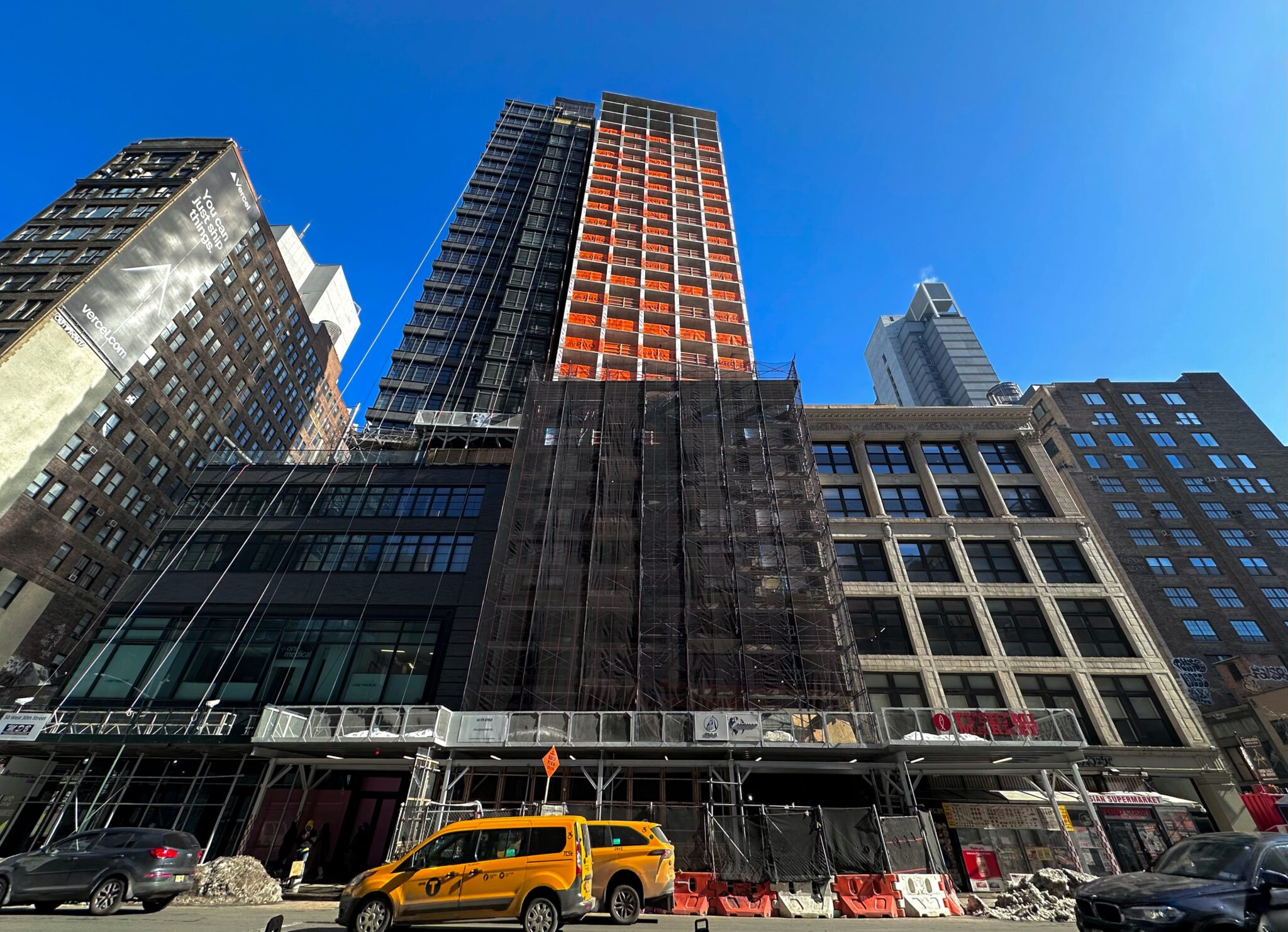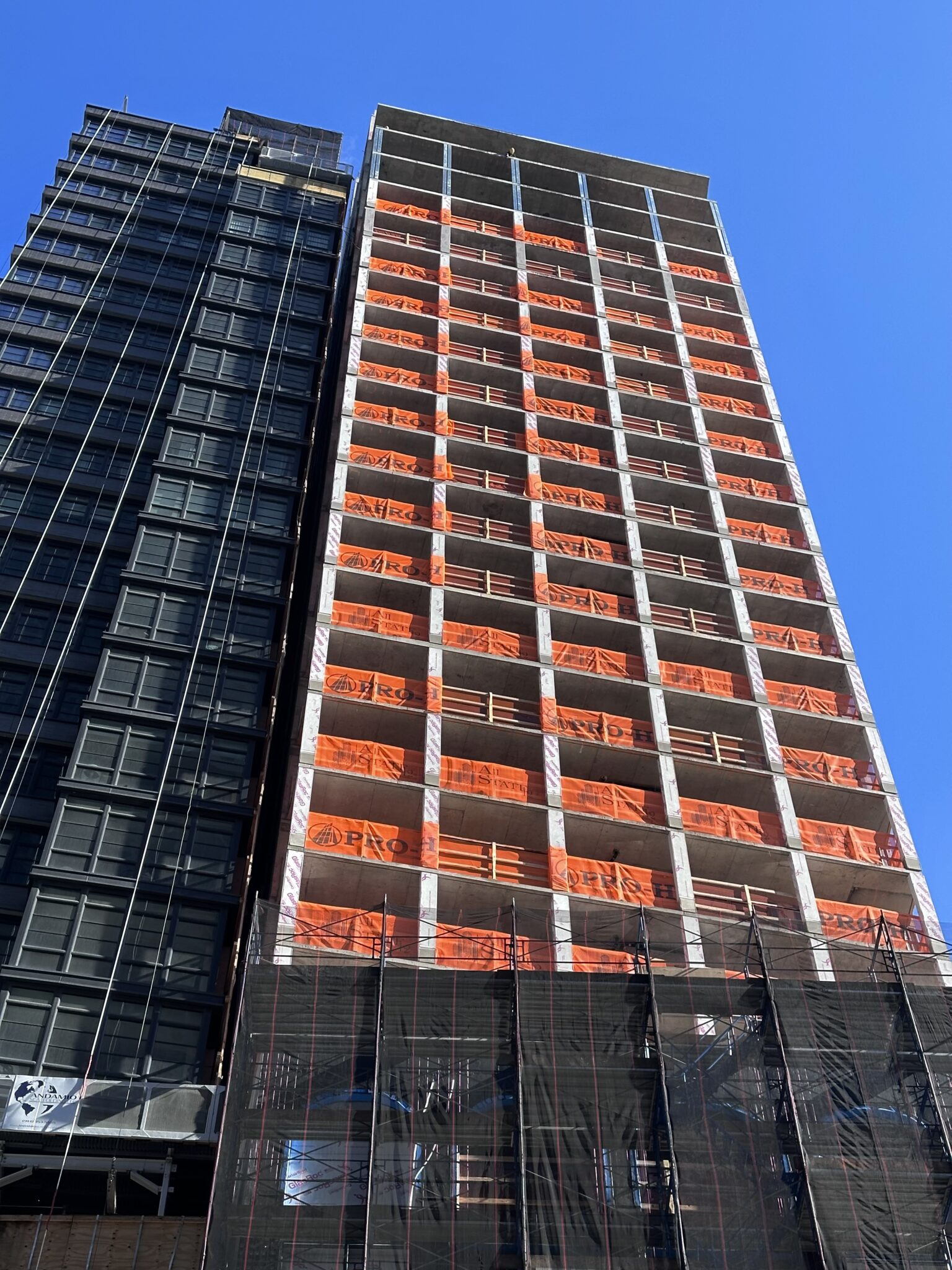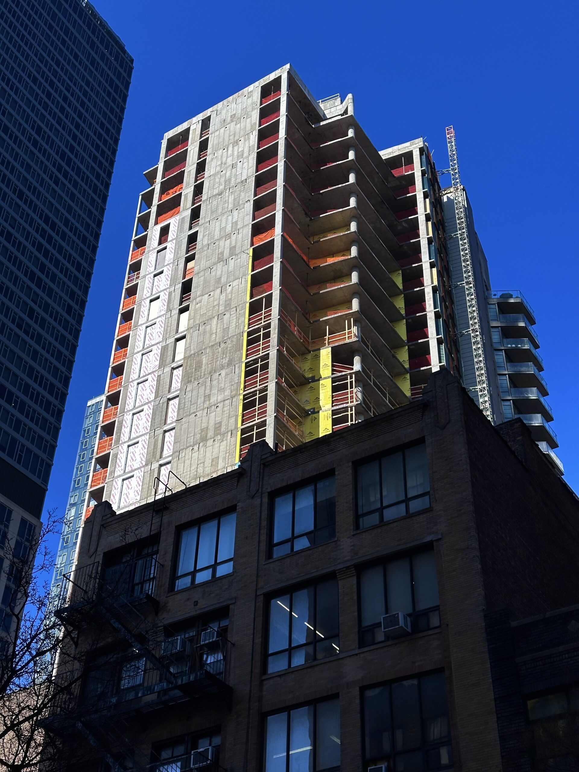 The entire reinforced concrete superstructure was built since our last update in May 2025, when only the foundations were complete. Scaffolding and netting cover the podium floors as crews work to install the light gray brick façade between the window voids.