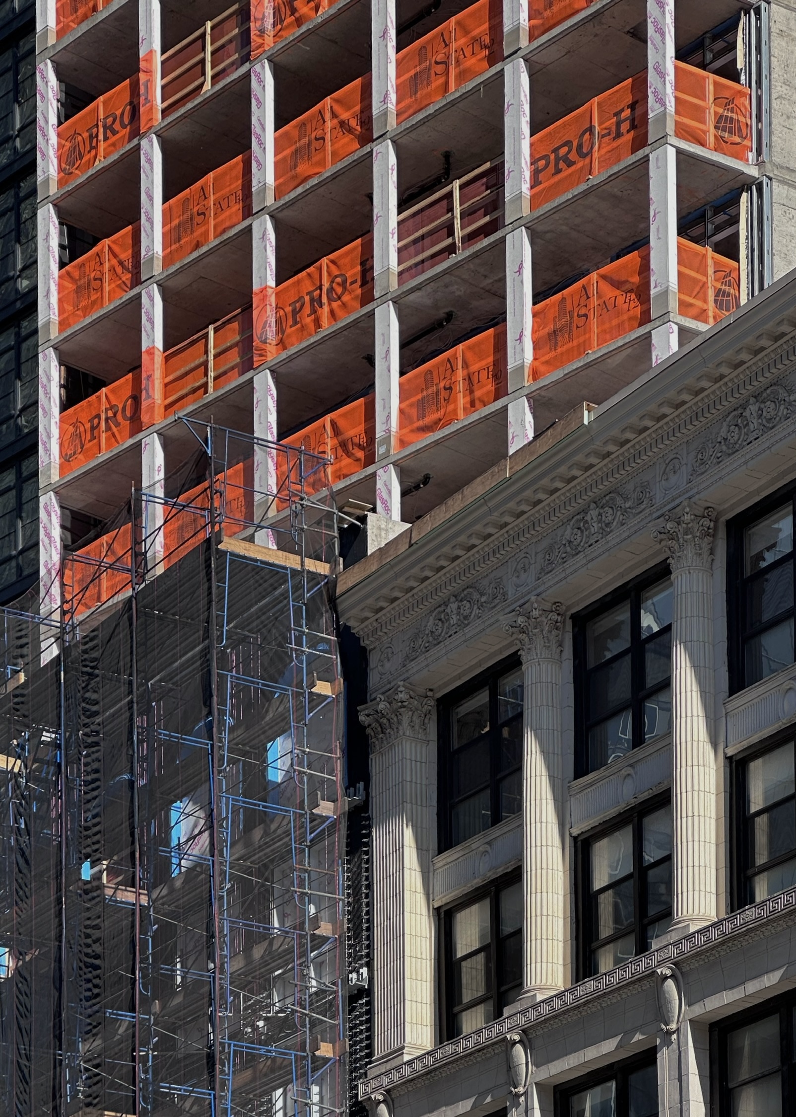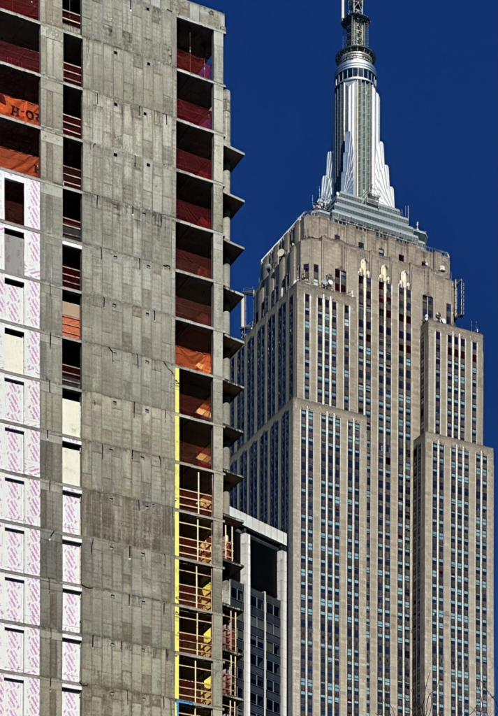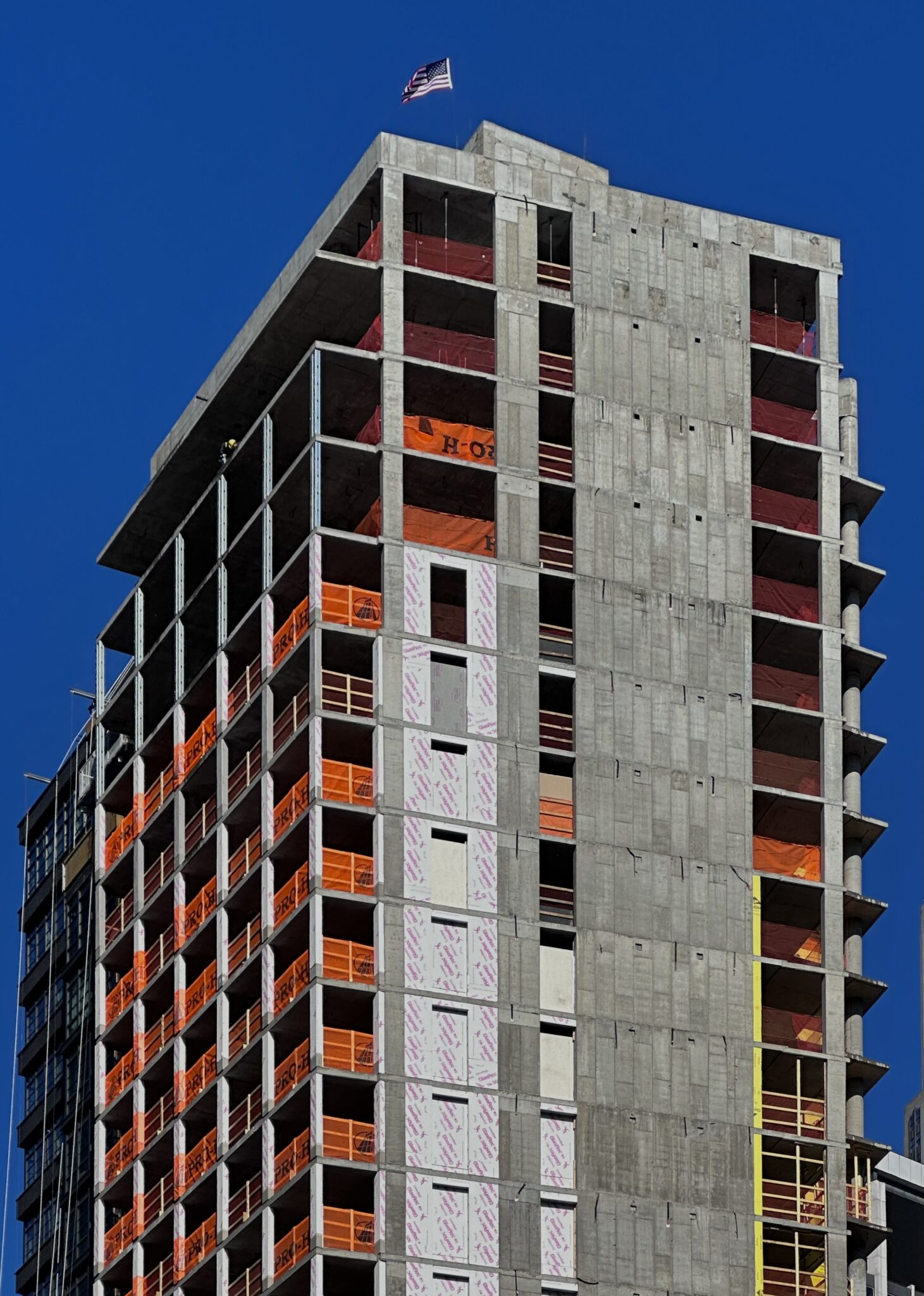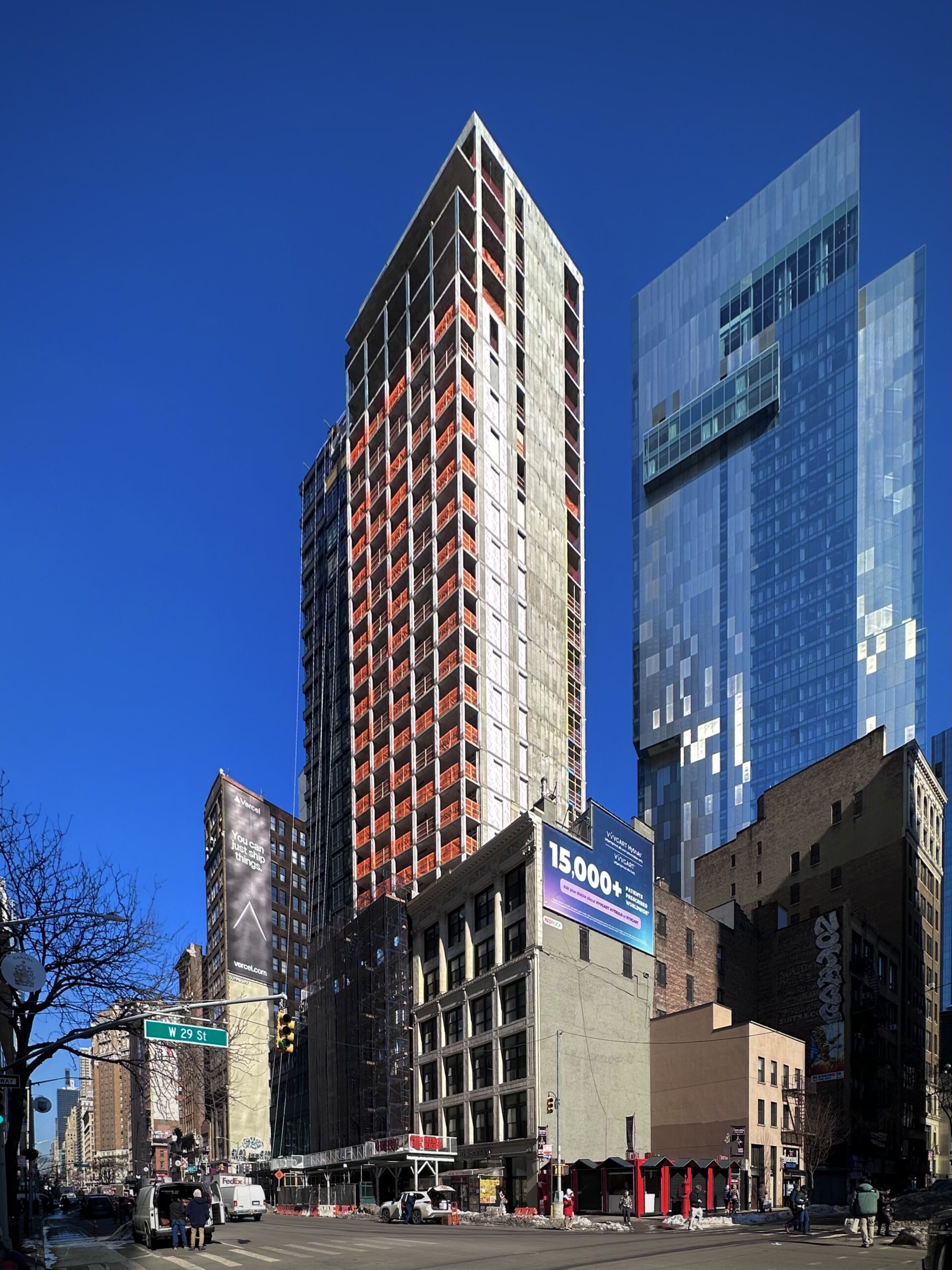 The entire reinforced concrete superstructure was built since our last update in May 2025, when only the foundations were complete. Scaffolding and netting cover the podium floors as crews work to install the light gray brick façade between the window voids.