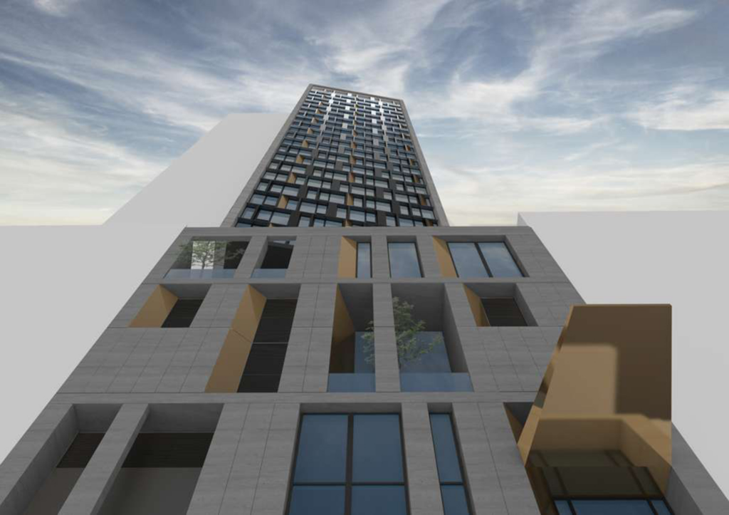 The renderings in the main photo and below preview the front and rear faces lined with loggia balconies. The visible southern lot line wall will be left mostly blank and etched with a geometric pattern, and the building will culminate in a crown with vertical ridges.