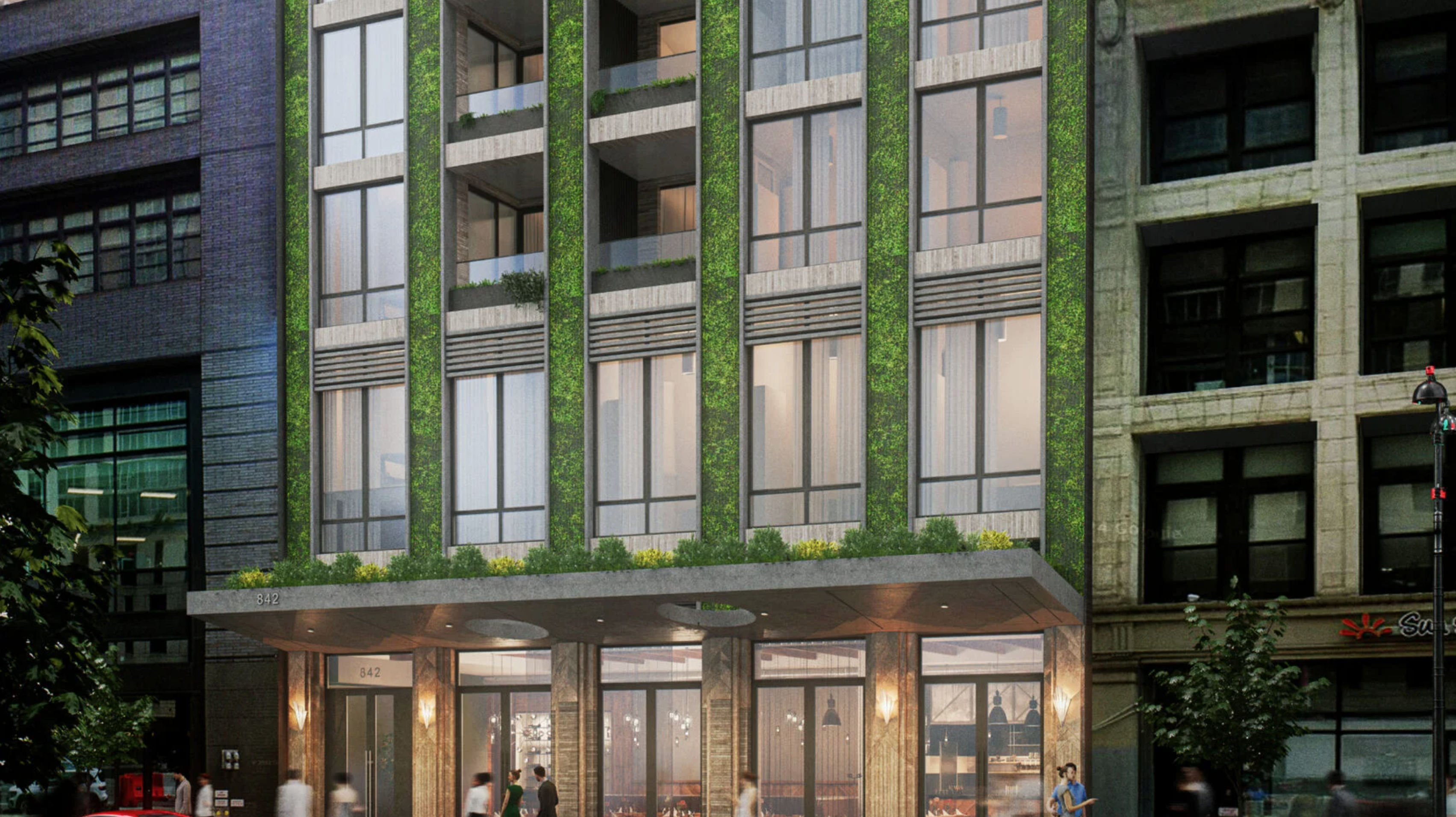 The following rendering offers a closer look at the base, which will feature hanging vegetation on the columns between the grid of floor-to-ceiling windows, as well as additional loggia balconies. The sloped sidewalk canopy will feature two circular cutouts and will be topped with low shrubbery.